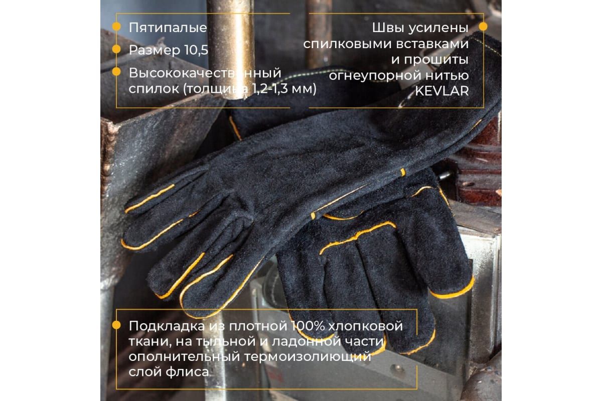 Швы усилены спилковыми вставками и прошиты огнеупорной нитью KEVLAR. Подходят для работ со сварочным оборудованием, металлом, садовых и строительных работ.