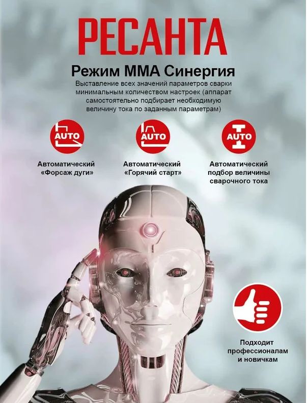 В режиме Синергии ММА, в зависимости от выбранного диаметра электрода и толщины металла, сила сварочного тока находится в оптимальном диапазоне, функции «форсаж дуги» и «горячий старт» подстраиваются автоматически.