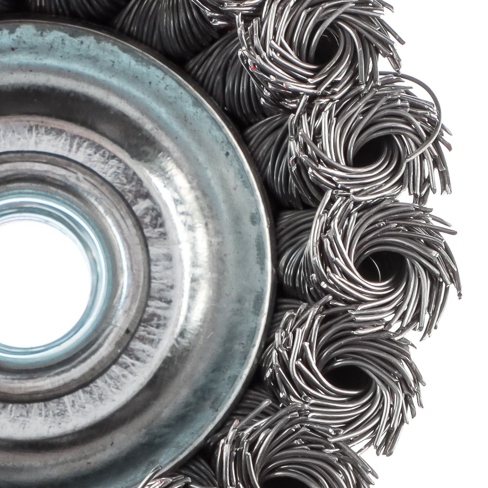 Металлическая щетка для УШМ ЕРМАК «Чашка» крученая 75мм/М14 имеет особую твердость и износостойкость и применяется для грубой очистки любых металлических поверхностей, а также выемок и фасок от ржавчины и грязи. Эффективна для зачистки сварных швов. Усилительное кольцо дольше сохраняет форму щетины, а посадочная гайка надежно фиксирует щетку на УШМ без риска соскока во время работы. Применяется на УШМ с максимальной производительностью до 125000 об./мин.