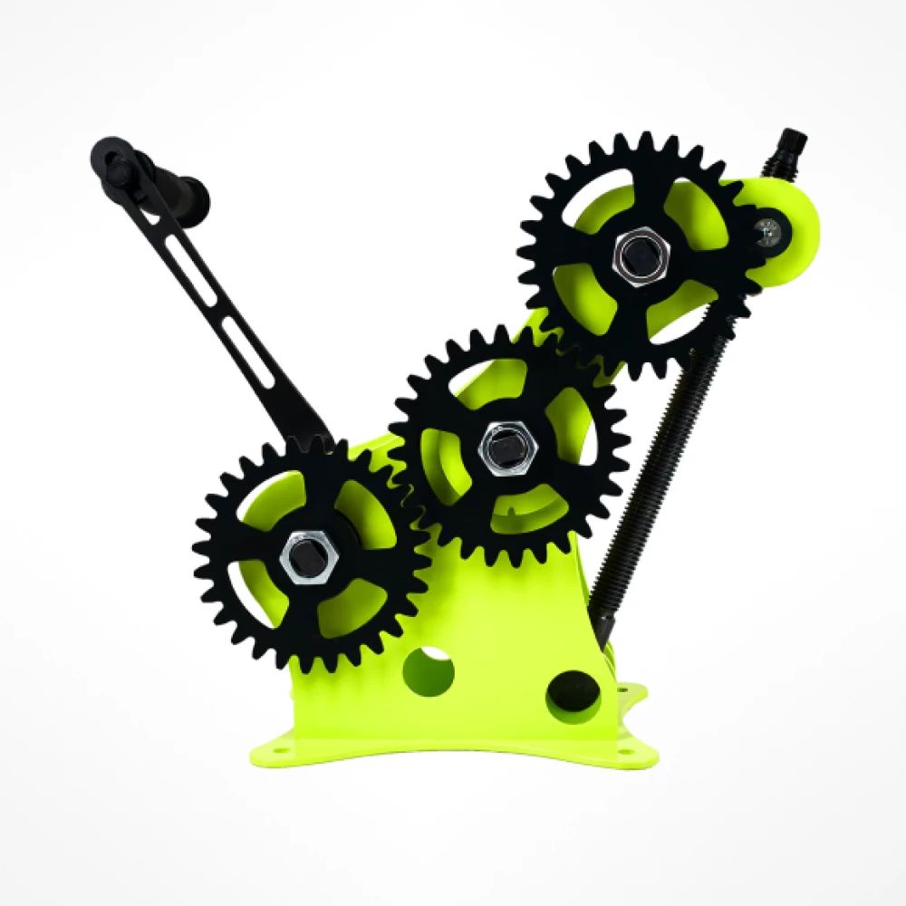 Понижатель передачи — устройство, позволяющее автоматизировать вращение валов с помощью дрели, шуруповёрта или перфоратора. Подходит для трубогибов DINO Стандарт. Понижатель передачи позволяет изменить тип вращения валов, из ручного (с помощью ручки) сделать его автоматическим. При этом можно обойтись без лишних затрат, задействовав уже имеющийся в вашем доме источник вращающего момента (дрель, шуруповёрт или перфоратор). Это позволит увеличить скорость вращения валков в 2 раза, при этом не вращать ручку вручную. Устройство простое и надёжное. В комплект понижателя передачи включены: три шайбы, гайка, два подшипниковых узла, шайба регулировочная, шестерня и вал. Размеры: длина 81 мм, диаметр — 72 мм.