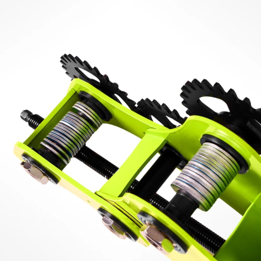 Трубогиб с тремя строго параллельными ведущими валами вместо стандартных одного или двух. Один вал — прижимной, два — опорные. Даже широкие и толстостенные профили не проскальзывают при прокате. Регулировочные шайбы в комплекте (32 шт.) легко устанавливаются на оси опорных валов, дополнительно удерживают деталь от смещения. Вал для ребра жёсткости (дополнительная комплектация) применяется для проката профиля на ребро.