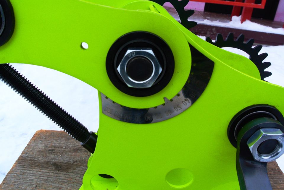 На основной раме установлен угломер — транспортир, по сути. Благодаря ему можно устанавливать нужные углы при гибки профилей. Как называет это производитель — радиусная линейка. С ней легко получать идеально ровные одинаковые дуги. Сделана из металла и надёжно закреплена на корпусе.