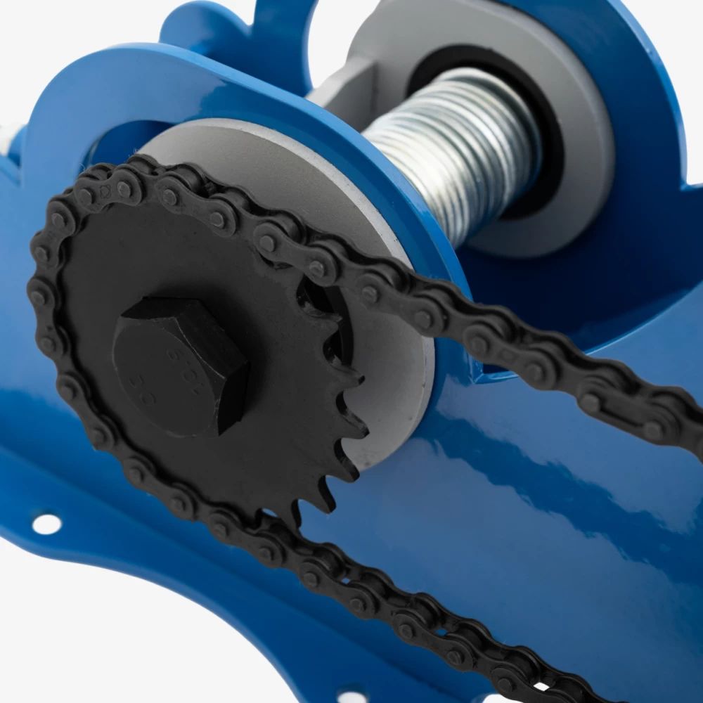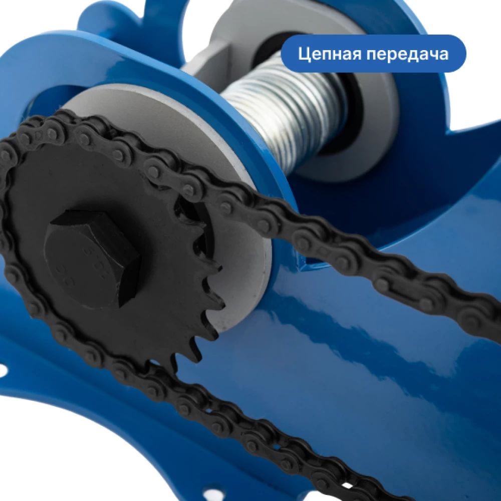 ЦЕПНАЯ ПЕРЕДАЧА Высокая скорость проката трубогибов «Удачный Премиум» во многом связана с использованием цепной передачи. КПД по этой схеме — 97%: профиль гнут два вращающихся вала, а не один, усилие передается без потерь. Нагрузка между валами распределяется равномерно, что снижает риски проскальзывания заготовки. Толщина звёздочек ведущего и ведомого валков — 6 мм. Натяжение цепи регулируется с помощью прижимных винтов.