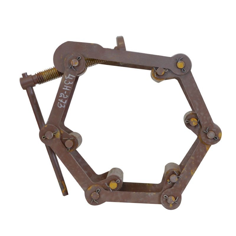Представляет собой многогранник, оснащенный нажимными роликами. Замыкающие звенья имеют также крюки и винтовой зажим, посредством которого уменьшается внутренний радиус центратора, что приводит к совпадению внешних поверхностей свариваемых труб.