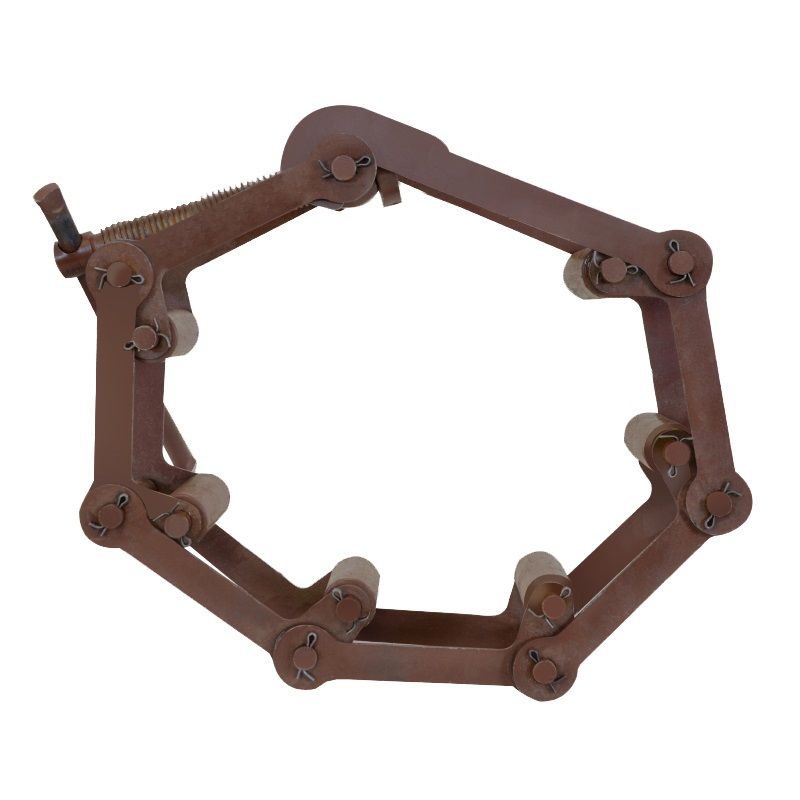 Представляет собой многогранник, оснащенный нажимными роликами. Замыкающие звенья имеют также крюки и винтовой зажим, посредством которого уменьшается внутренний радиус центратора, что приводит к совпадению внешних поверхностей свариваемых труб.